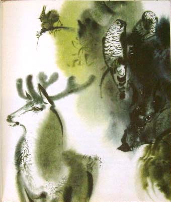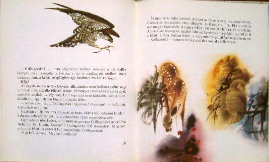 【商品番号】CE-759 【絵/文】 Mirko Hanak/Rudo Moric 【発行年/出版社】 1971年/MILADE LETA 【サイズ/ページ数】 23.5×20.3cm/40P ハードカバー ハンガリー語 【イラスト】 全面カラーイラスト4点。その他カラーイラスト15点。 【状態】 表紙に傷、若干痛み。折れ跡があるページがありますが、その他概ね良好。 【内容】 鹿が主人公のお話に、ミルコ・ハナーク挿絵を描いている絵本。 可愛い鹿や悪そうなキツネが美しいイラストで描かれています。 【価格】 SOLD OUT |