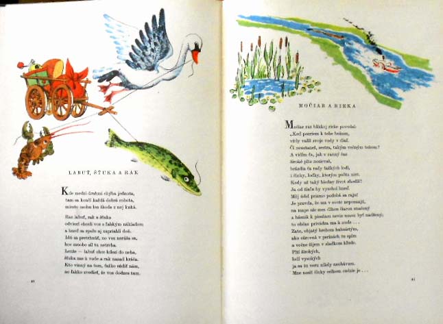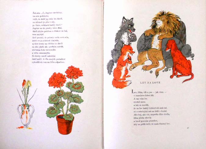 【商品番号】CE-565 【絵/文】 Richard Blaha/I.A. Krylov 【発行年/出版社】 1959年/MLADE LETA 【サイズ/ページ数】 30×21.5cm/80P ハードカバー スロバキア語 【イラスト】 ほぼ全てのページにカラーイラスト。 【状態】 カバー、表紙に痛み、汚れ。全てのページに渡って中央下部にシワ。シワ、汚れのあるページあり。その他概ね良好。 【内容】 ロシアの劇作家イヴァン・クルィロフの「寓話」にリハルド・ブラハがイラストを描いている絵本。 可愛い動物たちのイラストが古い絵本ならではの綺麗な印刷で見られます。 【価格】 SOLD OUT |