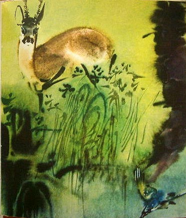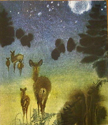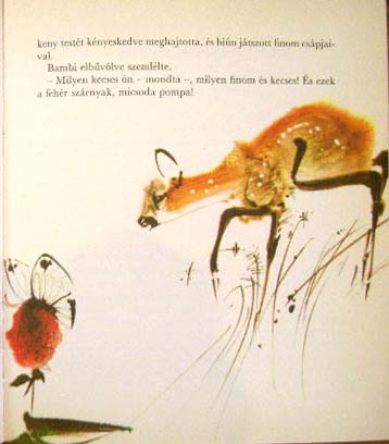 【商品番号】CE-094 【絵/文】 Mirko Hanak/Felix Salten 【発行年/出版社】 1985年/MORA 【サイズ/ページ数】 19.2×16.9cm/180P ハードカバー ハンガリー語 【イラスト】 全面カラーイラスト5点。その他カラーイラスト25点。 【状態】 表紙、裏表紙の表面コートに多数のシワ。のど割れあり。小口に汚れ。全体的に若干のヤケがありますが、その他概ね良好。 【内容】 「バンビ」と言えばディズニーを思い出しますが、原作はハンガリー出身の作家、フェリックス・ザルテンの作品です。 その「バンビ」にミルコ・ハナークがイラストを描いているのがハンガリーで見つけたこの絵本。 ミルコ・ハナークらしい美しいイラストです。 【価格】 SOLD OUT |