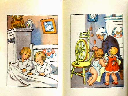 二つ折りの小さな冊子で、見開きにカラーの挿し絵が描かれているミニ絵本。