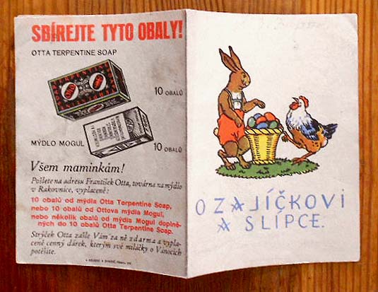 【商品番号】CME-006 【サイズ/ページ数】 11.1×8.5cm/8P チェコ語 【イラスト】 カラーイラスト4点(表紙含む)。 【状態】 表紙に落書き跡、角に折れ、若干汚れ。その他概ね良好。 【内容】 二つ折りの小さな冊子で、見開きにカラーの挿し絵が描かれているミニ絵本。 年代等不明ですが、イラスト、紙質、印刷からして1960年代以前のもので、裏表紙が広告になっているので、ノベルティーかと思われます。 【価格】 \750 |