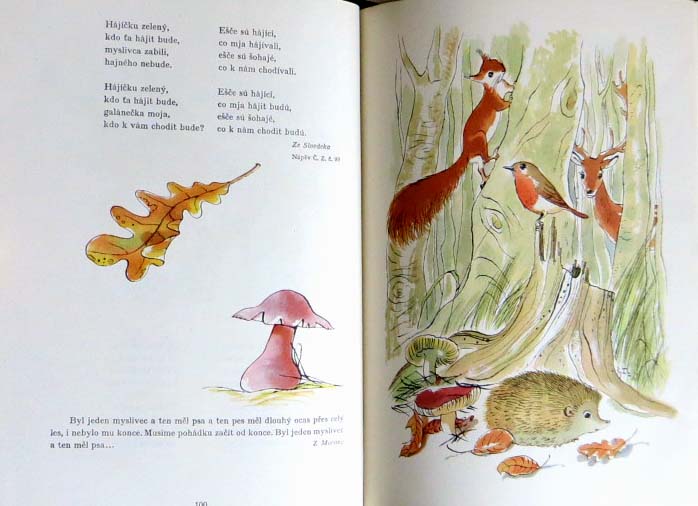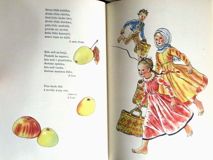 【商品番号】CE-943 【絵/文】 Karel Svolinsky/Karel Plicka Frantisek Volf 【発行年/出版社】 1953/SNKLHU 【サイズ/ページ数】 24.5×17.5cm/428P ハードカバー チェコ語 【イラスト】 カラーイラス100点以上。 【状態】 カバーに小さな破れ、若干の痛み。その他概ね良好。 【内容】 「チェコの1年」というタイトルで四季に分けた4巻が出ている分厚い絵本の秋版。 カレル・スヴォリンスキーの大小様々な美しいイラストがたっぷり詰まっていて、見ていて飽きる事がありません。 全面を使って描かれたイラストも多く、印刷の発色もとても綺麗です。 楽譜も多数掲載されています。 【価格】 SOLD OUT |
