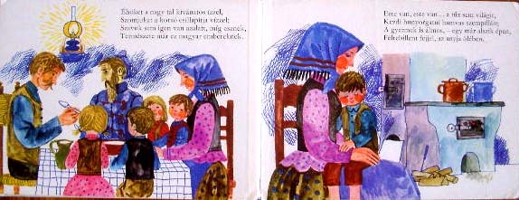 【商品番号】HE-082 【絵/文】 Reich Karoly/Arany Janos 【発行年/出版社】 1975年/MORA 【サイズ/ページ数】 17.7×23.3cm/12P ボードブック ハンガリー語 【イラスト】 全てのページにカラーイラスト。 【状態】 全体的に角に折れ跡、若干痛み。背表紙の布に小さな破れ。 【内容】 貧しくも仲良く暮らす家族の元を一人の男が訪れますが、家族は温かい食事で男をもてなすという、絵を見ているだけで心温まる絵本です。 レイク・カーロイの優しさが伝わるイラストが素敵です。 【価格】 SOLD OUT |