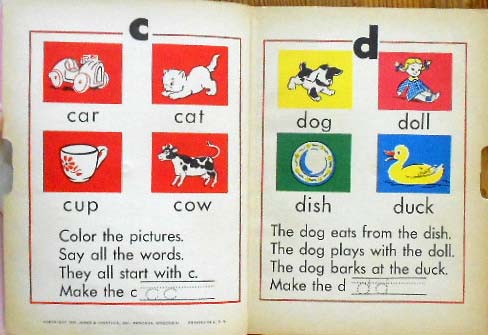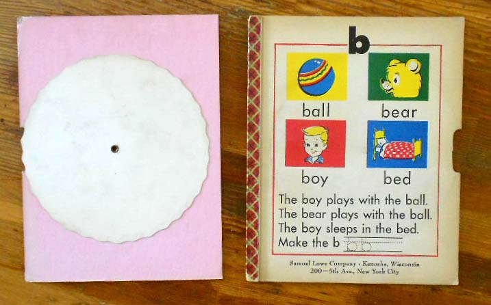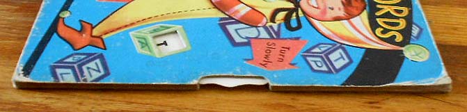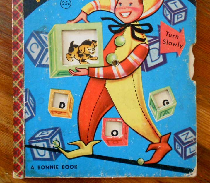 【商品番号】FE-049 【絵/文】 不明 【発行年/出版社】 1955/Samuel Lowe Company 【サイズ/ページ数】 20×16cm/18P ハードカバー 英語 【イラスト】 全てのページにカラーもしくは2色イラスト。 【状態】 表紙に痛みがあり、外れています。全体的に若干のヤケ。その他概ね良好。 【内容】 アメリカの人気絵本シリーズA BONNIE BOOKの一冊。 「言葉で遊ぶ」というタイトルで、子供が言葉を覚える為のABCブックです。 シンプルなイラストが素敵な絵本で、表紙には回すと単語とイラストが変わる仕掛けが付いています。 【価格】 \1800 |
