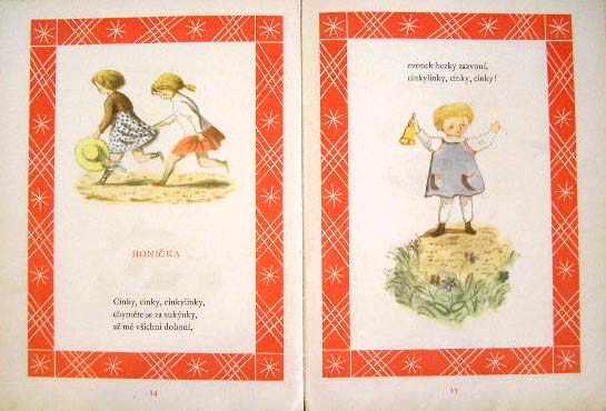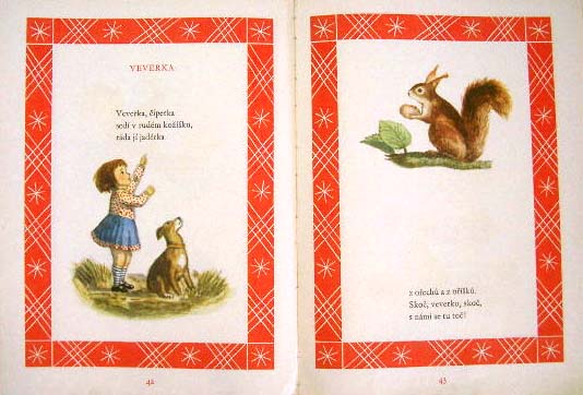 【商品番号】CE-772 【絵/文】 Karel Muller/Frantisek Hrubin 【発行年/出版社】 1953/SNDK 【サイズ/ページ数】 28.5×21cm/48P ハードカバー チェコ語 【イラスト】 ほぼ全てのページにカラーイラスト。 【状態】 カバーに破れ、痛み、汚れ(裏からテープで補修あり)。表紙に痛み。小さな破れのあるページ有り。その他若干の痛み、汚れあり。 【内容】 フランチシェク・フルビーンの詩に、カレル・ミュレルが優しい感じの素敵なイラストを描いている絵本。 見返しのイラストが前後で物語になっていてとてもカワイイです。 古い作品なので全体的に若干の痛みや汚れがありますが、この年代のものとしては状態は比較的良好です。 【価格】 SOLD OUT |