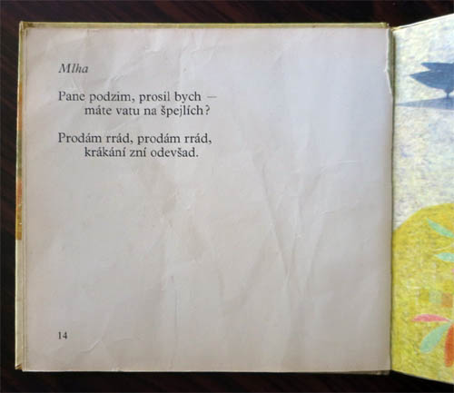 【商品番号】CE-558 【絵/文】 Josef Palecek/Miroslav Florian 【発行年/出版社】 1968/SNDK 【サイズ/ページ数】 19×20.5cm/48P ハードカバー チェコ語 【イラスト】 全面カラーイラスト20点。その他カラーイラスト5点。 【状態】 表紙に痛み。破れ、シワ、折れ、痛みあり。その他概ね良好。 【内容】 子ども向けの詩集に、ヨゼフ・パレチェクがとても可愛いイラストを描いている絵本。 1968年の初版です。 【価格】 SOLD OUT |