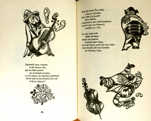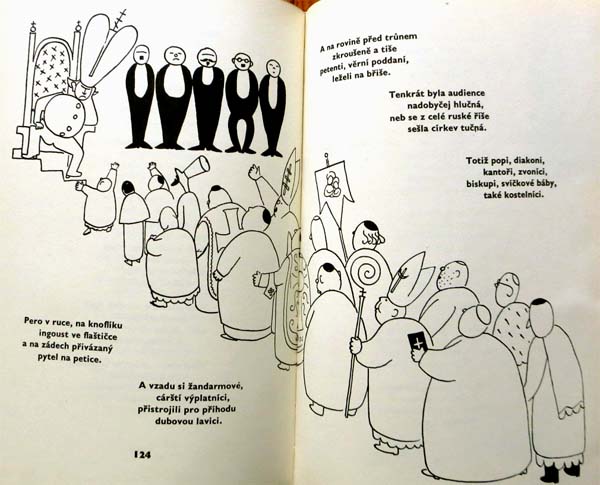 【商品番号】CE-477 【絵/文】 Jiri Trnka、Adolf Hoffmeister、Ota Janecek、Antonin Pelc、Zdenek Seydl/Karel Havlicek Borovsky 【発行年/出版社】 1962年/Klubu ctenaru 【サイズ/ページ数】 24.5×17cm/260P ハードカバー チェコ語 【イラスト】 カラーイラスト13点。モノクロイラスト81点。 【状態】 カバーに若干の破れ、痛み。若干シワあり。その他概ね良好。 【内容】 作家、詩人、ジャーナリストなど多方面で活躍したチェコのカレル・ハヴリーチェク・ボロフスキーの詩集に、イジー・トゥルンカ、ズデニェク・セイドゥル、アドルフ・ホフマイステル、オタ・ヤネチェク、アントニーン・ペレツという豪華なメンバーがイラストを手がけた作品。 ズデニェク・セイドゥル、アントニーン・ペレツはカラーイラスト、イジー・トゥルンカ、アドルフ・ホフマイステル、オタ・ヤネチェクはモノクロイラストです。 【価格】 \4400 |