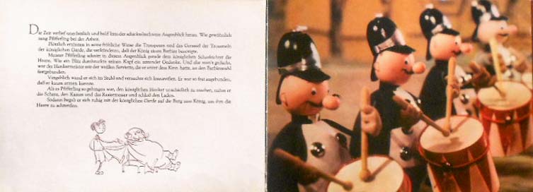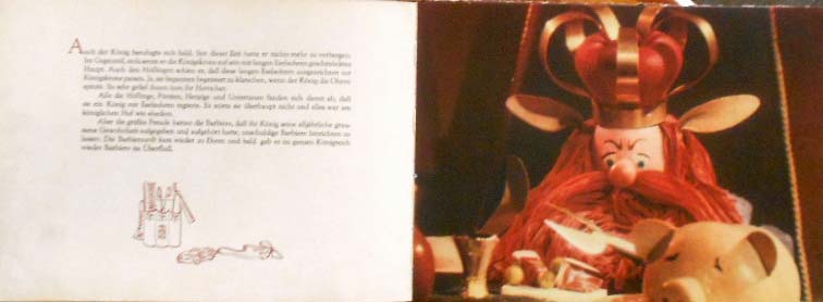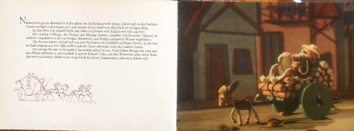 【商品番号】CE-676 【人形/イラスト】 Karel Zeman/Zdenek Rozkopal 【発行年/出版社】 1954年/ARTIA 【サイズ/ページ数】 21.5×29.5cm/32P ハードカバー ドイツ語 【イラスト】 全ての見開きにカラー写真とモノクロイラスト。 【状態】 表紙に若干痛みがありますが概ね良好。 【内容】 チェコ・アニメーションの巨匠、カレル・ゼマンの人形アニメーション「王様の耳はロバの耳」のパペット絵本のドイツ語版。 見開き右に人形アニメの1シーンが味のあるカラー写真で、左は文章と可愛いモノクロイラストです。 1950年制作のゼマン初の中編で、アニメーション監督として評価されるきっかけとなった代表的作品の絵本版で、昨年、刈谷市美術館で開催された「カレル・ゼマン展」の会場でも、原画や人形などど一緒にこの絵本がショーケースに飾られていました。 【価格】 \23800 |