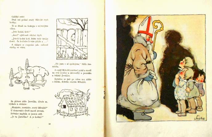 【商品番号】CE-543 【絵/文】 Kreslila Suska/Frantisek Pata 【発行年/出版社】 1945/V Liberci 【サイズ/ページ数】 28×21.5cm/30P ハードカバー チェコ語 【イラスト】 全面カラーイラスト13点。その他モノクロイラスト12点。 【状態】 表紙に痛み、汚れ。全体的に綴じが外れていて、汚れ、痛みがあります。落書きあり。 【内容】 素朴な感じのイラストが綺麗な発色の印刷と相まって、古い絵本ならではの素敵な質感を醸し出しています。 綴じが外れていて、全てのページがバラバラになっていますが、欠損はありません。 【価格】 SOLD OUT |