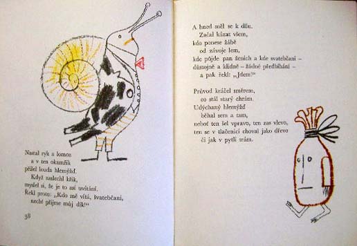 【商品番号】CE-460 【絵/文】 Ota Janecek/Radovan Kratky 【発行年/出版社】 1964/SNDK 【サイズ/ページ数】 22×17cm/78P ハードカバー チェコ語 【イラスト】 ほぼ全ての見開きにカラーイラスト(内全面カラーイラスト4点) 【状態】 カバーに破れ、痛み。本体良好。 【内容】 ネズミ、カエル、カタツムリなど、クレヨンで描かれたとても可愛いイラストが次々登場する楽しい絵本。 オタ・ヤネチェクの作品の中でもちょっとテイストの違ったおすすめ作品です。 【価格】 SOLD OUT |