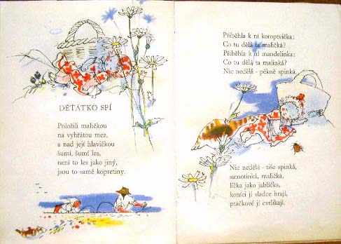 【商品番号】CE-843 【絵/文】 Adolf Zabransky/Jan Carek 【発行年/出版社】 1948/ALOIS HYNEK 【サイズ/ページ数】 29×21.5cm/68P ハードカバー チェコ語 【イラスト】 全てのページにカラーイラスト。 【状態】 カバーが下2cm程切り取られていて、破れ、痛みがあります。見返し部分にスタンプと破れ。綴じが開いている部分が2ヶ所あり。書き込み、スタンプあり。若干汚れのあるページあり。 【内容】 淡い色彩でとてもカワイイ、アドルフ・ザブランスキーのイラストが全てのページに描かれた綺麗な絵本。 1948年のALOIS HYNEK出版の初版で、残念ながら少し切り取られていたりしますが、カバーが付いているのはかなり貴重です。 この年代のものとしては状態も良く、再販のものとは明らかに違う印刷の質感が素晴らしい絵本です。 【価格】 SOLD OUT |