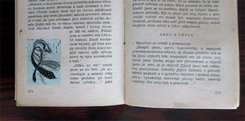 【商品番号】CE-516 【絵/文】 Antonin Michalcik/Jaroslav Simonides 【発行年/出版社】 1964年/SNDK 【サイズ/ページ数】 16.5×12cm/308P ソフトカバー チェコ語 【イラスト】 2色イラスト51点。 【状態】 表紙に痛み。綴じから外れかけているページあり。破れ、小さな穴、角に折れあり。その他概ね良好。 【内容】 1958〜1968年にかけてチェコのSNDKから出版されたSF、アドベンチャー小説のペーパーバック・シリーズ「KARAVANA」。 表紙デザインと挿絵がカッコいいものが多いので気になるシリーズです。 ポーランドのSF短編小説集。 【価格】 SOLD OUT |