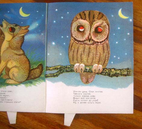 リス、クマ、ウサギ、ハリネズミなどの動物たちが登場し、目玉を動かして遊ぶ事が出来る仕掛け絵本。
