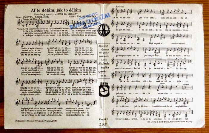 チェコの古い楽譜 1943年 作曲:Jos Stelbsky 2つ折り 17×13.5cm 表紙・裏面 破れ、折れ、汚れ
