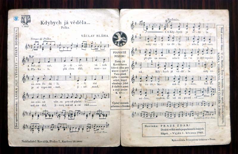 チェコの古い楽譜 1939年 作曲:Vaclav Blaha 2つ折り 16.5×13.5cm 表紙・裏面 破れ、ヤケ、折れ、書き込み、汚れ
