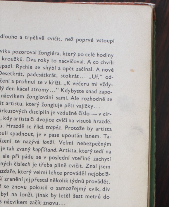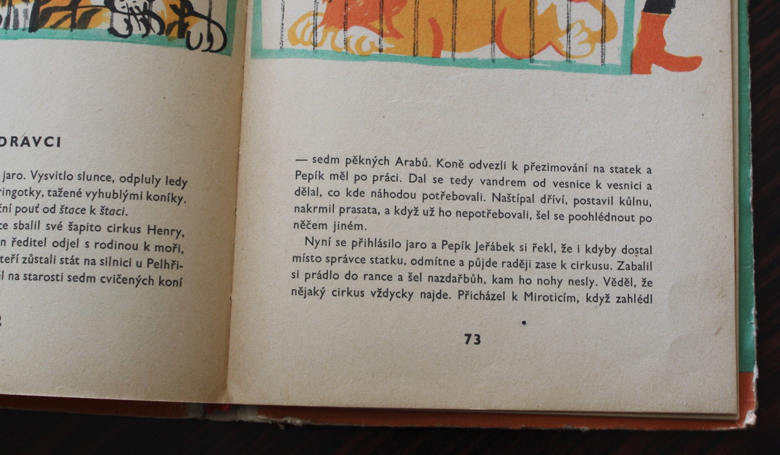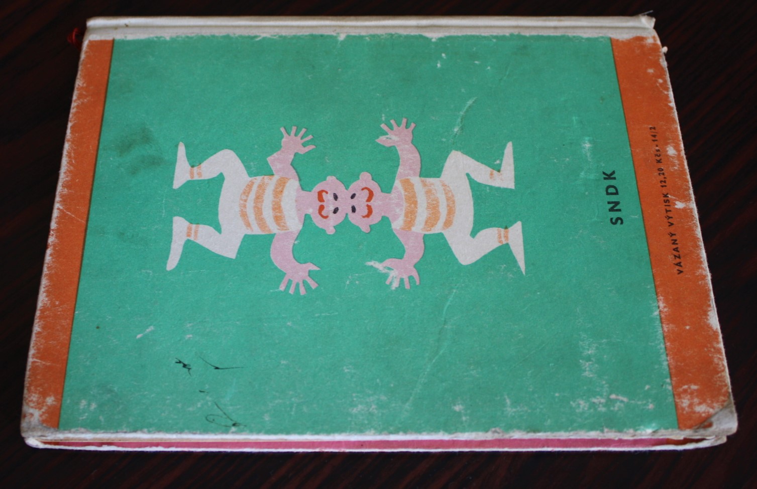 【商品番号】CE-730 【絵/文】 Ludek Vimr/Frantisek Janura 【発行年/出版社】 1959年/SNDK 【サイズ/ページ数】 22×16.8cm/100P ハードカバー チェコ語 【イラスト】 全面カラーイラスト9P。その他カラーイラスト26点。 【状態】 表紙に傷み、汚れ。全てのページに渡って角に折れ。ノドの下部にシワ。シワ、若干の汚れあり。その他概ね良好。 【内容】 サーカスを舞台にしたお話にルヂェク・ヴィムルのパステル調のイラストが可愛い絵本。 ルヂェク・ヴィムル初期の作品で、イラストのタッチが少し違っています。 【価格】 \3000 |