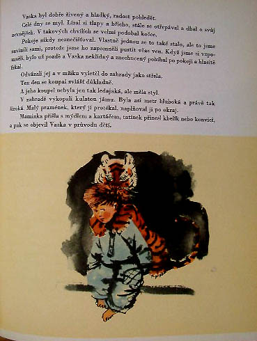 【商品番号】CE-409 【タイトル】 TYGRIK VASKA 【絵/文】 Mirko Hanak/Olga Perovska 【発行年/出版社】 1965/SNDK 【サイズ/ページ数】 26.3×20.5cm/192P ハードカバー チェコ語 【イラスト】 カラーイラスト55点。 【状態】 表紙に若干の傷み。半分程のページに渡って痛み、のどの上部にシワ。折れ、汚れあり。見返しに破れ、痛み。その他概ね良好。 【内容】 動物と人間の交流を描いた6つのお話にミルコ・ハナークが美しいイラストを描いています。 ミルコ・ハナーク初期の作品で、ちょっと違ったタッチのイラストですが、優しい感じの綺麗なイラストです。 【価格】 \3300 |