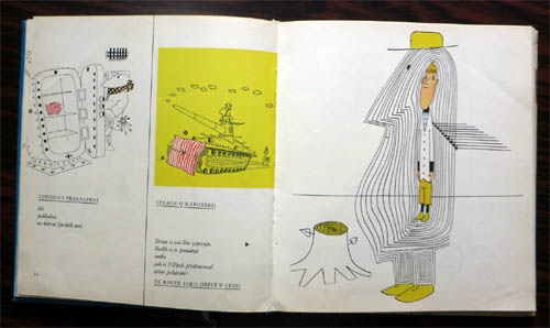【商品番号】CE-168 【絵/文】 Vladimir Fuka/Jiri Kolar 【発行年/出版社】 1964年/SNDK 【サイズ/ページ数】 24×21.8cm/158P ハードカバー チェコ語 【イラスト】 ほぼ全てのページにカラーもしくはモノクロイラスト。 【状態】 表紙に痛み。全てのページに渡ってノドの下部にシワ。数ページに折れ、若干の汚れ、痛みあり。その他概ね良好。 【内容】 ウラジミール・フカがイラストを手がけている絵本。 どのページを開いてもとにかく素晴らしいイラストとデザインで、フカの作品の中でも最高傑作と言われる絵本です。 【価格】 SOLD OUT |