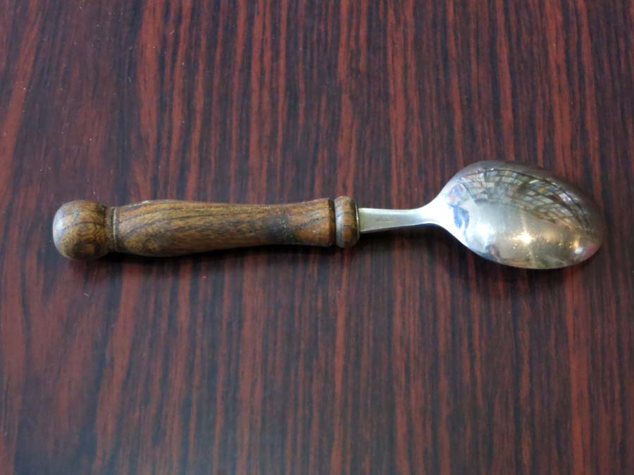 木製の取っ手が付いたステンレス製スプーン。