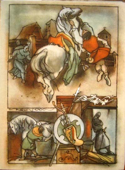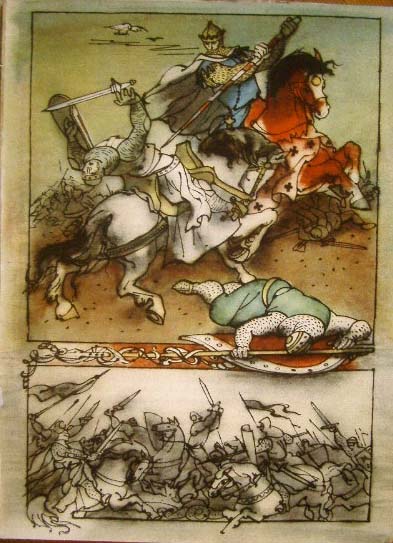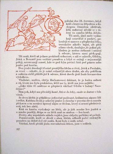 【商品番号】CE-448 【絵/文】 Adolf Zabransky/Vladimir Drnak 【発行年/出版社】 1941/MELANTRICH 【サイズ/ページ数】 24.5×18.5cm/122P ソフトカバー チェコ語 【イラスト】 カラーイラスト8点。その他モノクロイラスト32点。 【状態】 表紙に破れ(テープで補修あり)、痛み。扉に書き込み。その他概ね良好。 【内容】 アドルフ・ザブランスキーが挿し絵を描いた初期の作品で、中世ヨーロッパの戦争の様子が渋い色彩の素敵なイラストで描かれています。 文章の書き出しに添えられる赤一色で描かれた版画のようなイラストも素晴らしいです。 【価格】 SOLD OUT |